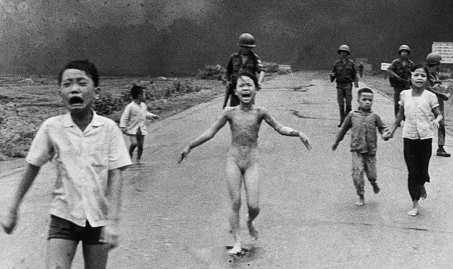 A jovem garota foge em desespero, nua, logo após uma bomba napalm cair sobre a vila em que ela residia, no Vietnã. Tirada por Nick Ut, a imagem ganhou o Prêmio Pulitzer e mostra a garota sofrendo com as queimaduras no corpo.