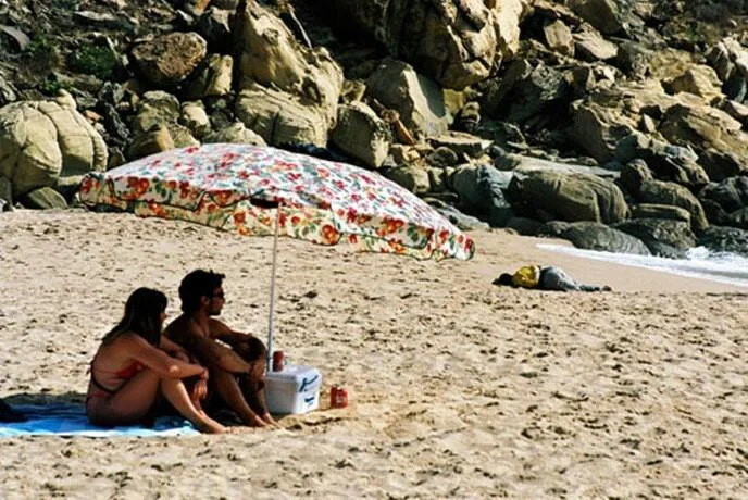 A imagem mostra um casal de turistas sob um guarda-sol, acompanhado de uma caixa de isopor com cervejas geladas, enquanto, ao fundo, um corpo jogado na areia aguarda ser recolhido. Trata-se de um imigrante que tentava chegar à Europa pelo mar e acabou falecendo antes de concretizar esse sonho.