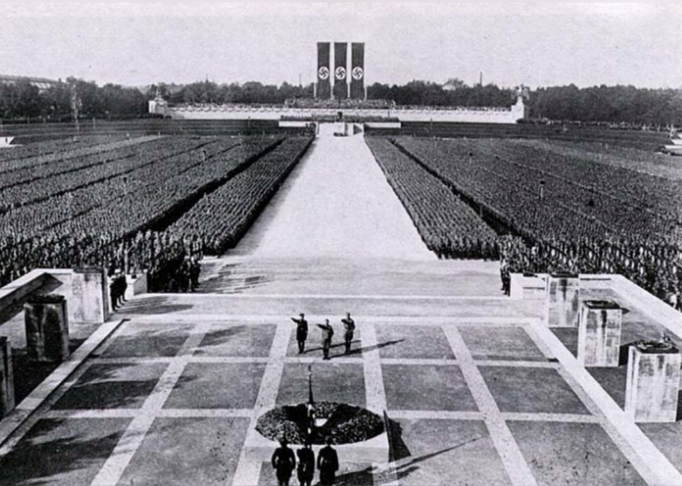 Os infames Ralis de Nuremberg onde aconteciam encontros do Partido Nazista, uma propriedade em estilo anfiteatro de 11 quilômetros quadrados projetada pelo arquiteto nazista Albert Speer.