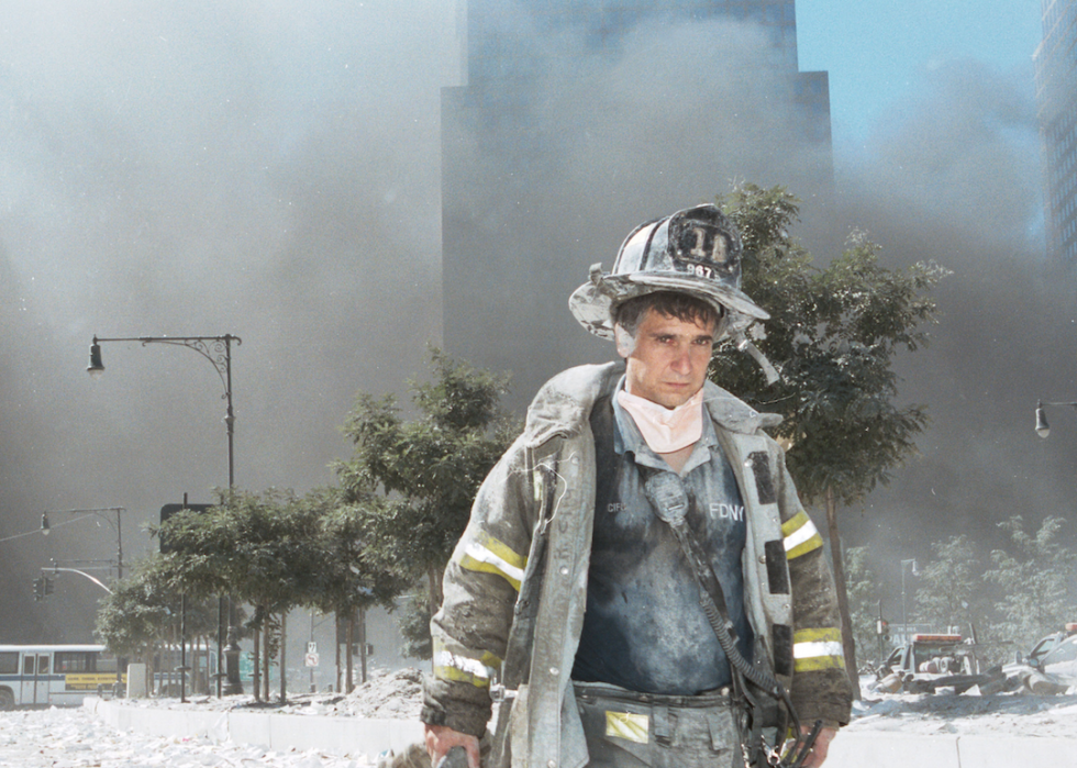 A fotografia de um bombeiro não identificado da cidade de Nova York saindo do Ground Zero após o colapso das Torres Gêmeas do World Trade Center captura a sensação generalizada de choque, devastação e incerteza.
